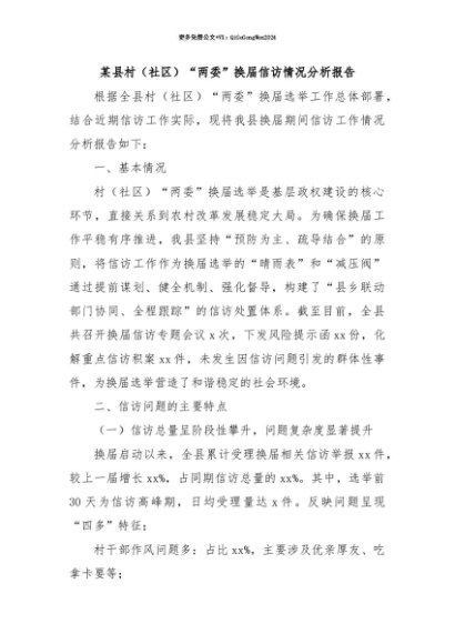 【七哥公文】2025年:【七哥公文】某县村(社区)“两委”换届信访情况分析报告+更多免费公文+VX:QiGeGongWen2024+更多免费公文+VX:QiGeGongWen2024