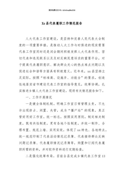 【七哥公文】2025年:【七哥公文】Xx县代表履职工作情况报告+更多免费公文+VX:QiGeGongWen2024+更多免费公文+VX:QiGeGongWen2024
