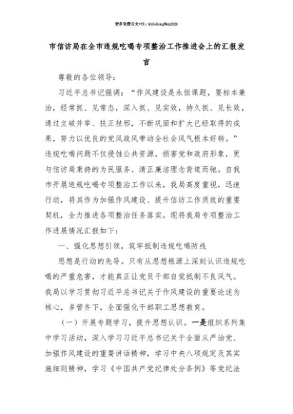 【七哥公文】2025年:【七哥公文】市信访局在全市违规吃喝专项整治工作推进会上的汇报发言+更多免费公文+VX:QiGeGongWen2024+更多免费公文+VX:QiGeGongWen2024