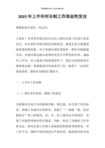 【七哥公文】2025年:【七哥公文】2025年上半年河长制工作表态性发言+更多免费公文+VX:QiGeGongWen2024+更多免费公文+VX:QiGeGongWen2024