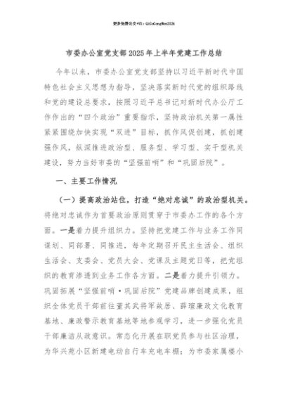 【七哥公文】2025年:【七哥公文】市委办公室党支部2025年上半年党建工作总结+更多免费公文+VX:QiGeGongWen2024+更多免费公文+VX:QiGeGongWen2024