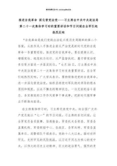 【七哥公文】2025年:【七哥公文】推进自我革命 深化管党治党——习主席在中共中央政治局第二十一次集体学习时的重要讲话和节日问候在全军引起热烈反响+更多免费公文+VX:QiGeGongWen2024+更多免费公文+VX:QiGeGongWen2024