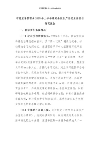 【七哥公文】2025年:【七哥公文】市场监督管理局2025年上半年落实全面从严治党主体责任情况报告+更多免费公文+VX:QiGeGongWen2024+更多免费公文+VX:QiGeGongWen2024