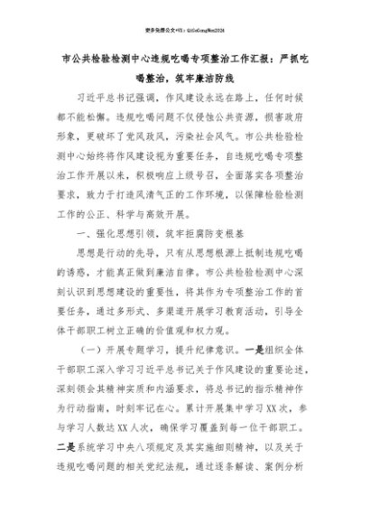 【七哥公文】2025年:【七哥公文】市公共检验检测中心违规吃喝专项整治工作汇报:严抓吃喝整治,筑牢廉洁防线+更多免费公文+VX:QiGeGongWen2024+更多免费公文+VX:QiGeGongWen2024