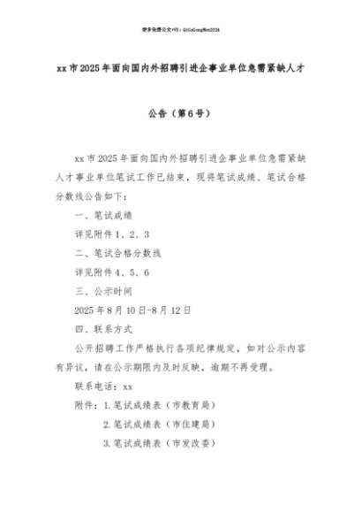 【七哥公文】2025年:【七哥公文】xx市2025年面向国内外招聘引进企事业单位急需紧缺人才公告(第6号)+更多免费公文+VX:QiGeGongWen2024+更多免费公文+VX:QiGeGongWen2024