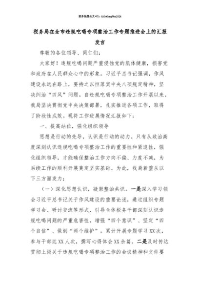 【七哥公文】2025年:【七哥公文】税务局在全市违规吃喝专项整治工作专题推进会上的汇报发言+更多免费公文+VX:QiGeGongWen2024+更多免费公文+VX:QiGeGongWen2024