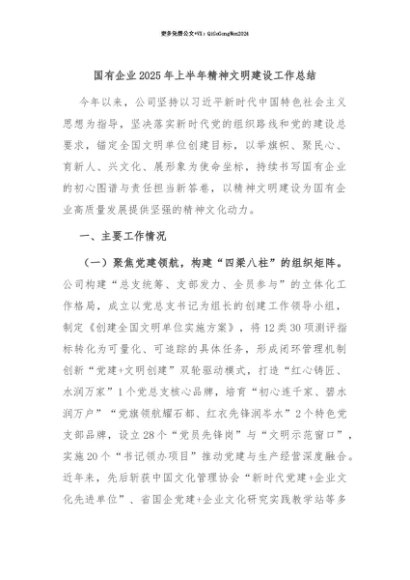 【七哥公文】2025年:【七哥公文】国有企业2025年上半年精神文明建设工作总结+更多免费公文+VX:QiGeGongWen2024+更多免费公文+VX:QiGeGongWen2024