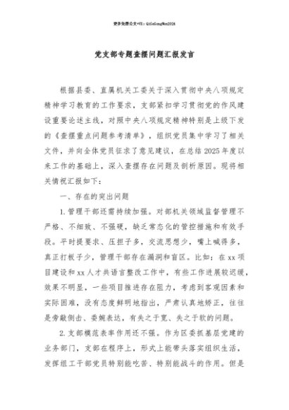 【七哥公文】2025年:【七哥公文】党支部专题查摆问题汇报发言+更多免费公文+VX:QiGeGongWen2024+更多免费公文+VX:QiGeGongWen2024