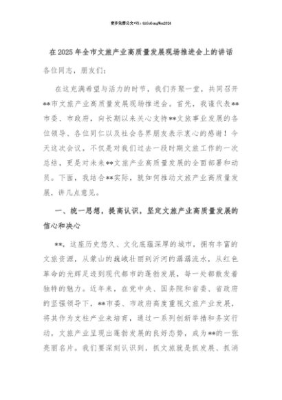 【七哥公文】2025年:【七哥公文】在2025年全市文旅产业高质量发展现场推进会上的讲话+更多免费公文+VX:QiGeGongWen2024+更多免费公文+VX:QiGeGongWen2024