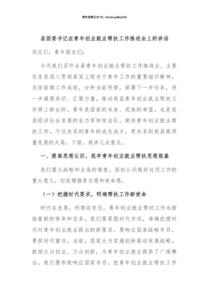【七哥公文】2025年:【七哥公文】县团委书记在青年创业就业帮扶工作推进会上的讲话+更多免费公文+VX:QiGeGongWen2024+更多免费公文+VX:QiGeGongWen2024
