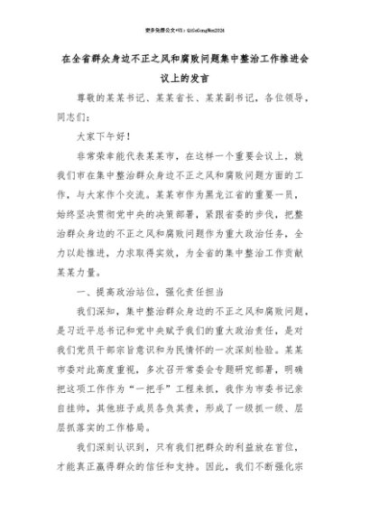 【七哥公文】2025年:【七哥公文】在全省群众身边不正之风和腐败问题集中整治工作推进会议上的发言+更多免费公文+VX:QiGeGongWen2024+更多免费公文+VX:QiGeGongWen2024