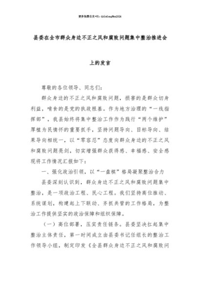 【七哥公文】2025年:【七哥公文】县委在全市群众身边不正之风和腐败问题集中整治推进会上的发言+更多免费公文+VX:QiGeGongWen2024+更多免费公文+VX:QiGeGongWen2024