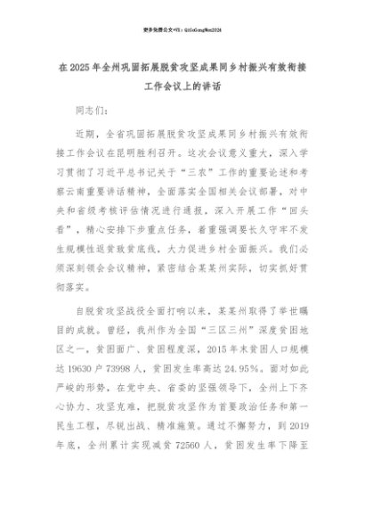 【七哥公文】2025年:【七哥公文】在2025年全州巩固拓展脱贫攻坚成果同乡村振兴有效衔接工作会议上的讲话+更多免费公文+VX:QiGeGongWen2024+更多免费公文+VX:QiGeGongWen2024