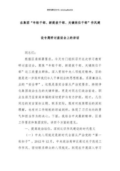 【七哥公文】2025年:【七哥公文】在集团“年轻干部、新提拔干部、关键岗位干部”作风建设专题研讨座谈会上的讲话+更多免费公文+VX:QiGeGongWen2024+更多免费公文+VX:QiGeGongWen2024