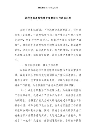 【七哥公文】2025年:【七哥公文】区税务局违规吃喝专项整治工作进展汇报+更多免费公文+VX:QiGeGongWen2024+更多免费公文+VX:QiGeGongWen2024