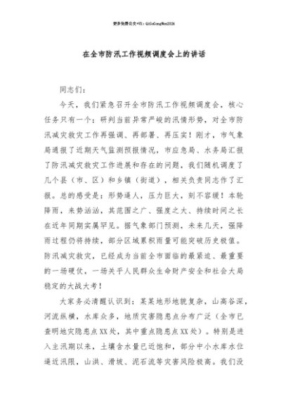 【七哥公文】2025年:【七哥公文】在全市防汛工作视频调度会上的讲话+更多免费公文+VX:QiGeGongWen2024+更多免费公文+VX:QiGeGongWen2024