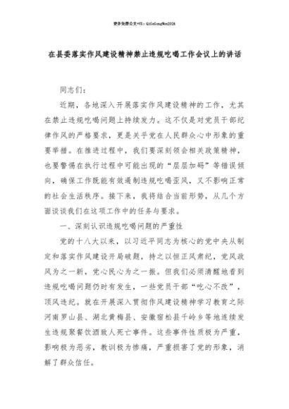 【七哥公文】2025年:【七哥公文】在县委落实作风建设精神禁止违规吃喝工作会议上的讲话+更多免费公文+VX:QiGeGongWen2024+更多免费公文+VX:QiGeGongWen2024