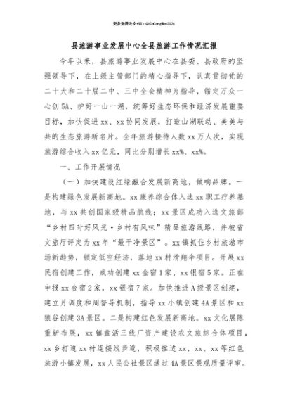 【七哥公文】2025年:【七哥公文】县旅游事业发展中心全县旅游工作情况汇报+更多免费公文+VX:QiGeGongWen2024+更多免费公文+VX:QiGeGongWen2024