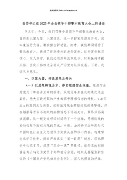 【七哥公文】2025年:【七哥公文】县委书记在2025年全县领导干部警示教育大会上的讲话+更多免费公文+VX:QiGeGongWen2024+更多免费公文+VX:QiGeGongWen2024