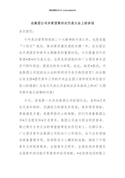 【七哥公文】2025年:【七哥公文】在集团公司共青团第四次代表大会上的讲话+更多免费公文+VX:QiGeGongWen2024+更多免费公文+VX:QiGeGongWen2024