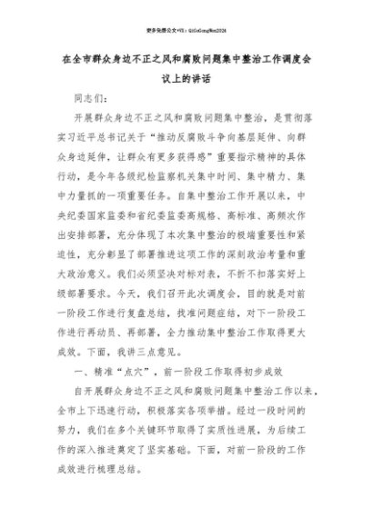 【七哥公文】2025年:【七哥公文】在全市群众身边不正之风和腐败问题集中整治工作调度会议上的讲话+更多免费公文+VX:QiGeGongWen2024+更多免费公文+VX:QiGeGongWen2024