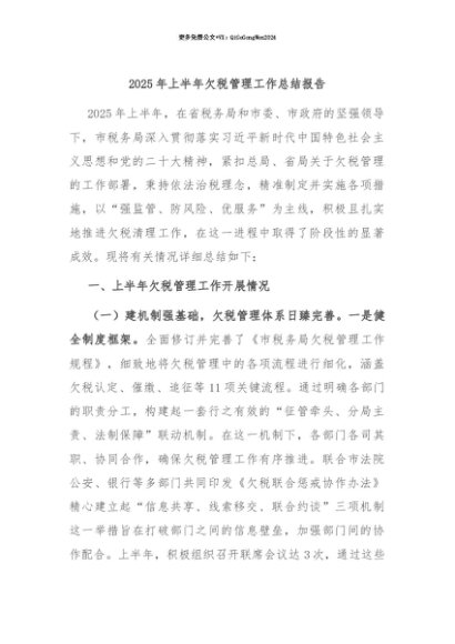 【七哥公文】2025年:【七哥公文】2025年上半年欠税管理工作总结报告+更多免费公文+VX:QiGeGongWen2024+更多免费公文+VX:QiGeGongWen2024