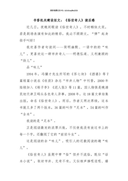 【七哥公文】2025年:【七哥公文】书香机关建设征文:《俗世奇人》读后感+更多免费公文+VX:QiGeGongWen2024+更多免费公文+VX:QiGeGongWen2024