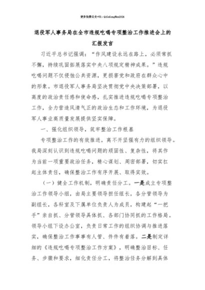 【七哥公文】2025年:【七哥公文】退役军人事务局在全市违规吃喝专项整治工作推进会上的汇报发言+更多免费公文+VX:QiGeGongWen2024+更多免费公文+VX:QiGeGongWen2024