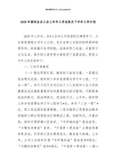 【七哥公文】2025年:【七哥公文】2025年国有企业工会上半年工作总结及下半年工作计划+更多免费公文+VX:QiGeGongWen2024+更多免费公文+VX:QiGeGongWen2024