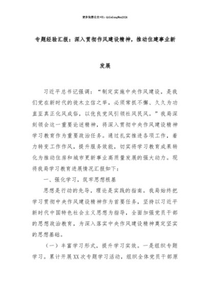 【七哥公文】2025年:【七哥公文】专题经验汇报:深入贯彻作风建设精神,推动住建事业新发展+更多免费公文+VX:QiGeGongWen2024+更多免费公文+VX:QiGeGongWen2024