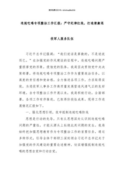 【七哥公文】2025年:【七哥公文】违规吃喝专项整治工作汇报:严守纪律红线,打造清廉退役军人服务队伍+更多免费公文+VX:QiGeGongWen2024+更多免费公文+VX:QiGeGongWen2024