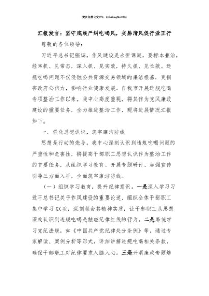 【七哥公文】2025年:【七哥公文】汇报发言:坚守底线严纠吃喝风,交易清风促行业正行+更多免费公文+VX:QiGeGongWen2024+更多免费公文+VX:QiGeGongWen2024