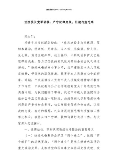 【七哥公文】2025年:【七哥公文】法院院长党课讲稿:严守纪律底线,杜绝违规吃喝+更多免费公文+VX:QiGeGongWen2024+更多免费公文+VX:QiGeGongWen2024