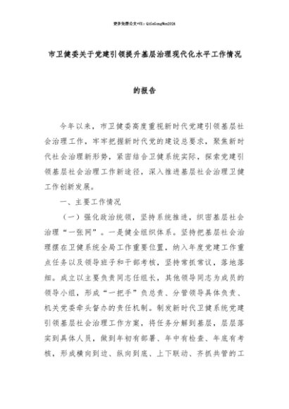 【七哥公文】2025年:【七哥公文】市卫健委关于党建引领提升基层治理现代化水平工作情况的报告+更多免费公文+VX:QiGeGongWen2024+更多免费公文+VX:QiGeGongWen2024