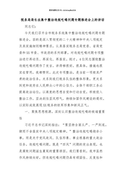 【七哥公文】2025年:【七哥公文】税务局局长在集中整治违规吃喝问题专题推进会上的讲话+更多免费公文+VX:QiGeGongWen2024+更多免费公文+VX:QiGeGongWen2024