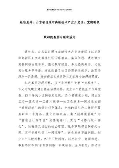 【七哥公文】2025年:【七哥公文】经验总结:山东省日照市高新技术产业开发区:党建引领赋动能基层治理有活力+更多免费公文+VX:QiGeGongWen2024+更多免费公文+VX:QiGeGongWen2024