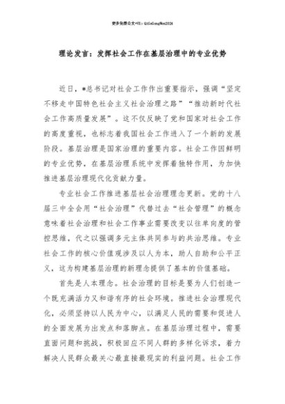 【七哥公文】2025年:【七哥公文】理论发言:发挥社会工作在基层治理中的专业优势+更多免费公文+VX:QiGeGongWen2024+更多免费公文+VX:QiGeGongWen2024