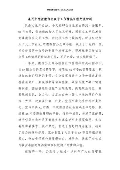 【七哥公文】2025年:【七哥公文】某民主党派微信公众号工作情况汇报交流材料+更多免费公文+VX:QiGeGongWen2024+更多免费公文+VX:QiGeGongWen2024