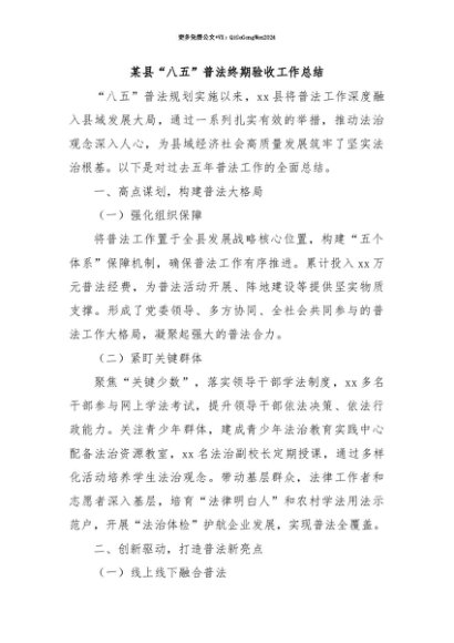 【七哥公文】2025年:【七哥公文】某县“八五”普法终期验收工作总结+更多免费公文+VX:QiGeGongWen2024+更多免费公文+VX:QiGeGongWen2024