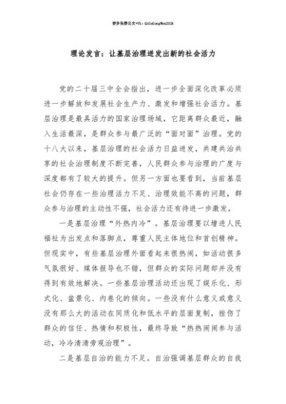 【七哥公文】2025年:【七哥公文】理论发言:让基层治理迸发出新的社会活力+更多免费公文+VX:QiGeGongWen2024+更多免费公文+VX:QiGeGongWen2024