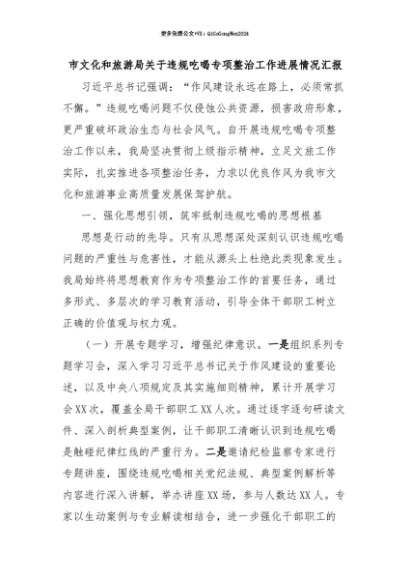 【七哥公文】2025年:【七哥公文】市文化和旅游局关于违规吃喝专项整治工作进展情况汇报+更多免费公文+VX:QiGeGongWen2024+更多免费公文+VX:QiGeGongWen2024