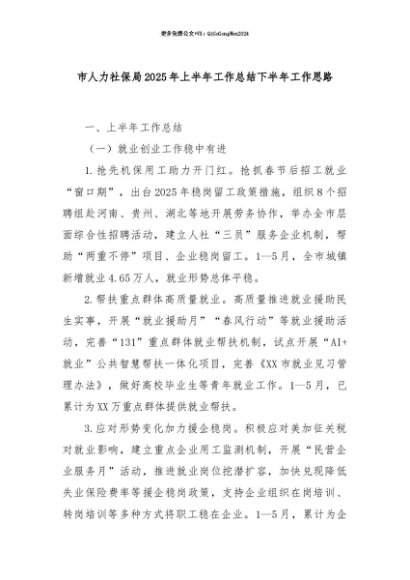 【七哥公文】2025年:【七哥公文】市人力社保局2025年上半年工作总结下半年工作思路+更多免费公文+VX:QiGeGongWen2024+更多免费公文+VX:QiGeGongWen2024