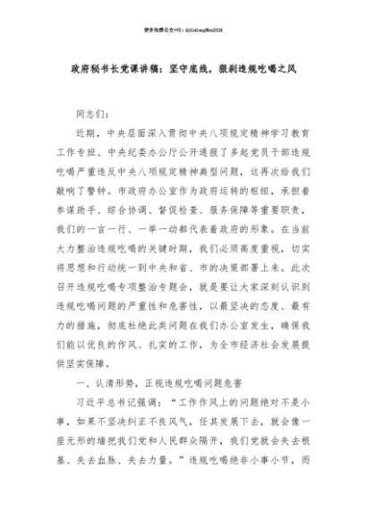 【七哥公文】2025年:【七哥公文】政府秘书长党课讲稿:坚守底线,狠刹违规吃喝之风+更多免费公文+VX:QiGeGongWen2024+更多免费公文+VX:QiGeGongWen2024