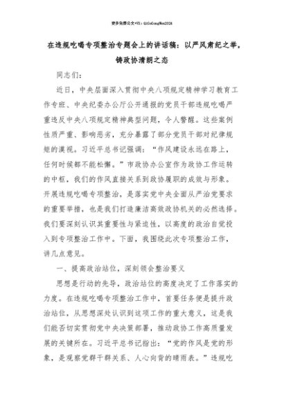 【七哥公文】2025年:【七哥公文】在违规吃喝专项整治专题会上的讲话稿:以严风肃纪之举,铸政协清朗之态+更多免费公文+VX:QiGeGongWen2024+更多免费公文+VX:QiGeGongWen2024