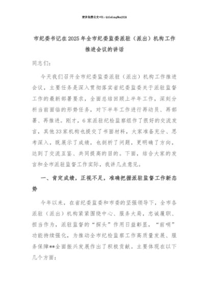 【七哥公文】2025年:【七哥公文】市纪委书记在2025年全市纪委监委派驻(派出)机构工作推进会议的讲话+更多免费公文+VX:QiGeGongWen2024+更多免费公文+VX:QiGeGongWen2024