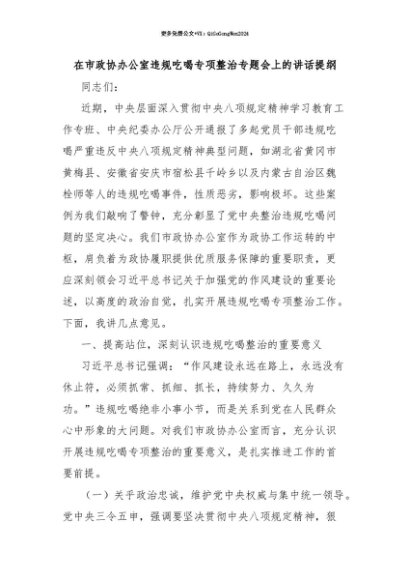 【七哥公文】2025年:【七哥公文】在市政协办公室违规吃喝专项整治专题会上的讲话提纲+更多免费公文+VX:QiGeGongWen2024+更多免费公文+VX:QiGeGongWen2024