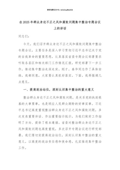 【七哥公文】2025年:【七哥公文】在2025年群众身边不正之风和腐败问题集中整治专题会议上的讲话+更多免费公文+VX:QiGeGongWen2024+更多免费公文+VX:QiGeGongWen2024