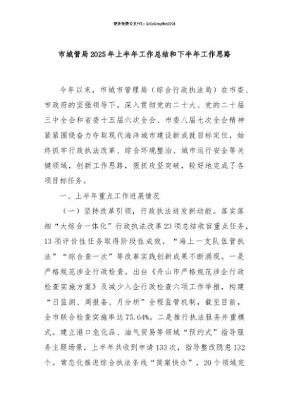 【七哥公文】2025年:【七哥公文】市城管局2025年上半年工作总结和下半年工作思路+更多免费公文+VX:QiGeGongWen2024+更多免费公文+VX:QiGeGongWen2024