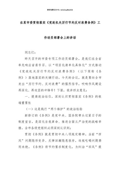 【七哥公文】2025年:【七哥公文】在某市委贯彻落实《党政机关厉行节约反对浪费条例》工作动员部署会上的讲话+更多免费公文+VX:QiGeGongWen2024+更多免费公文+VX:QiGeGongWen2024