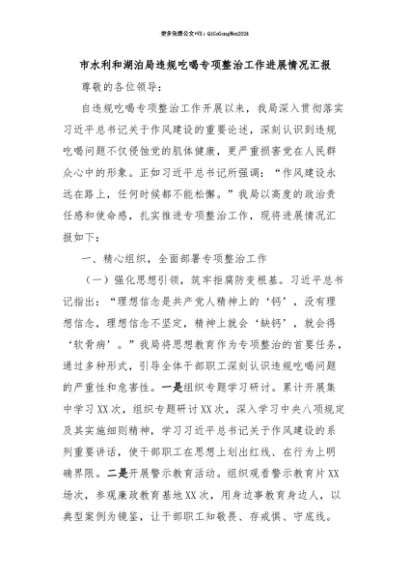 【七哥公文】2025年:【七哥公文】市水利和湖泊局违规吃喝专项整治工作进展情况汇报+更多免费公文+VX:QiGeGongWen2024+更多免费公文+VX:QiGeGongWen2024